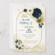 Beautiful navy blue ivory white and gold flowers with gold leaves on a gold geometric frame birthday party invitation.