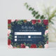 Navy Marsala Country Rustic Wedding RSVP Cards - features a rustic navy blue wood background with greenery, roses and other floral elements in shades of blush pink, marsala, burgundy and more.