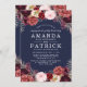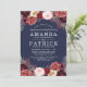 Navy Marsala Peony Engagement Party Invitations - features a navy blue background with various peonies, roses, and other floral elements in shades of Marsala, burgundy, blue pink, grey and more. See the matching collection on this page to complete the look for your event.