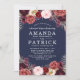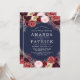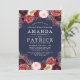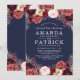 Navy Marsala Peony Rehearsal Dinner Invitations - features a navy blue background with various peonies, roses, and other floral elements in shades of Marsala, burgundy, blue pink, grey and more. See the matching collection on this page to complete the look for your event.