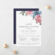Watercolor floral arrangement in shades of mauve, navy blue and green, rehearsal dinner invitation. Chic and modern typography design. Back of card features solid navy blue colour.