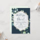 This Wedding Invitation features delicate hand-painted watercolor eucalyptus leaves adorned by a modern white gold geometric frame, set against a navy background with navy text. Easily customise as required!