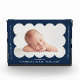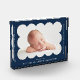 Simple and modern birth announcement photo block featuring your baby's photo nestled inside of a navy scalloped frame. Personalise the photo block by adding your baby's name and additional information in white lettering.