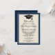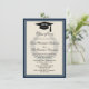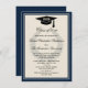 Navy Dark Blue background with mortarboard graduation cap, with monogrammed three letter initials. Classic grad invite for male or female college graduates, for trade school, graduate school, speciality major, high school or any level. This inexpensive, cheap value priced school colours graduation announcement or graduation ceremony invitation is perfect for inviting loved ones to an open house, reception, formal lor casual graduation party. Classic design features traditional laurel wreath emblem, personalised monogram, along with elegant script writing and old English style monogram. Extremely easy to personalise with your student's information. Formal and traditional classic style graduation invite for men or women, girls or boys of any age.