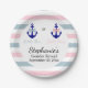 Navy nautical anchor with pastel pink bow and pastel blue bow tie gender reveal paper plates. The design features navy anchors with pink and blue bow and bow tie and the text "Little Man or Little Miss". Also you can add your custom text to the design.