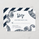 This octopus RSVP response card is perfect for a nautical theme wedding. The design features navy blue octopus tentacles wrapped around the card. The backside is a navy blue and white stripe. Purchase the coordinating items to match (sold separately) which can be found in our 'Navy Nautical Octopus' collection.