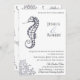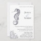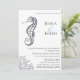 Navy blue vintage drawn seahorse and coral wedding invitation. Personalise text font style, colour, and size.