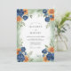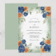 Vibrant navy blue and burnt orange watercolor florals create a sophisticated yet earthy aesthetic. This design features lush navy blue poppies and terracotta roses nestled among soft sage green foliage. Ideal for an autumnal or late summer outdoor event, the artwork evokes a sense of natural beauty and elegance. A subtle wash of pale green provides a soft backdrop for the rich, saturated blooms.