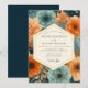 Elicit a sense of opulent romance with this stunning artistic floral design. The composition features lush, painterly chrysanthemums and roses in vibrant paprika orange and muted teal tones. These dramatic blossoms are set against a deep navy background, creating a moody and sophisticated atmosphere. This beautiful botanical arrangement is perfect for a chic and memorable autumn affair.