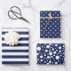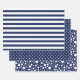 Three patterns in navy blue and white: basic stripes, polka dots and random spots.