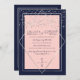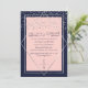 This elegant and modern wedding engagement party invitation is ideal for a classy and formal event. It features a faux printed sparkly silver glitter confetti sprinkled over a thin geometric diamond and rectangle border with a navy blue thick border underneath and blush pink fill. It's chic, luxurious, pretty, simple, and trendy; the perfect design for your special day.