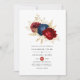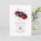 Crimson red and navy blue watercolor floral wedding invitation with faux foil gold foliage and vintage velvet damask reverse.