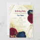 Beautiful birthday party invitation featuring dark navy blue and red flowers and gold leaves .