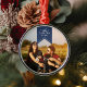Personalise this elegant round ornament with a favourite photo to commemorate a special year. Customise with your family name and the year in white on a navy blue ribbon banner at the top.
