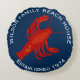 Red, white and blue, round red lobster family beach house throw pillow. Personalise with curved, printed text at top and bottom. Include the family name and year established. A big lobster silhouette in the centre.