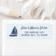 This unique personalised return address label template features a sailboat silhouette in navy blue on a sea of light blue horizontal stripes and your names in a lively script. This isn't a true silhouette in the strict sense in that it's not a solid colour. It includes bits without the navy colour, which lends a warm, handmade flavour that reminds us of a woodblock print or a nicely weathered wood carving. In fact, the illustration that inspired this design was originally made with a stamp, which accounts for its charm. You can use two first names, your family name, a business name, or any other format that suits your needs. You can also change the style, colour and size of the text.. Create your own custom look with the intuitive design tools, and please check our store for a large selection of return address labels. We've made a special collection of nautical themed return address labels as well as a more general collection, so please click on the collections tab in our shop to see more!
