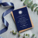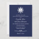 Nautical wedding invitation in navy blue and white with an anchor and ship's wheel symbol and a rope heart.