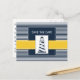 navy blue and white stripes with yellow border and white dotted border featuring an lighthouse, Mod nautical wedding save the date. Matching products also available.