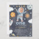 Sweet outer space or first trip around the sun first birthday invitation that features the little boy's photo in the space helmet. This first trip around the sun 1st birthday invitation also features, a small sun, planets, stars, spaceship and spaceman and has a dark blue background.