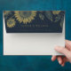 Complete your sunflower wedding suite with this elegant envelope featuring a deep navy flap adorned with vintage-style sunflower illustrations and personalised names and return address. The interior reveals a subtle sunflower motif, adding a refined, romantic touch to the unboxing experience. Designed to pair seamlessly with the full navy and golden-yellow floral wedding collection. Note: all colours are flat printed, not metallic or foil.