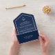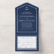 Elegant all in one wedding invitation in navy blue with white rope frames and a white anchor and elegant fonts for a nautical wedding.