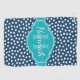 Stylish, trendy dark blue and white dot pattern in the background, topped with a bright teal blue label featuring a customisable name and monogram template.