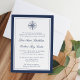 Elegant navy blue bordered nautical wedding invitations feature a compass illustration at the top with your wedding details in classic script and serif lettering. Cards reverse to narrow navy and white coastal stripes.