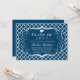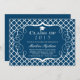 This 5x7 elegant graduation announcement / party invitation has a navy blue and white quatrefoil moroccan flower pattern design in the background. There is a white swirl frame in the middle with a cap at the top. You can easily customise all of the party information in the middle.