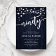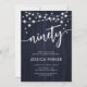 90th Birthday Party Invitation. Rustic design with navy white wood pattern. Classy invite card featuring fairy string lights and white script font. Perfect for a stylish ninetieth bday celebration. Personalize with your own details. Can be customized for any age! Printed Zazzle invitations or instant download digital printable template.