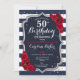 Elegant floral feminine 50th birthday invitation with your photo at the back of the card. Glam navy white red design with faux glitter silver. Features navy blue and white stripes, red roses, script font and confetti. Perfect for a stylish adult bday celebration party. Personalise with your own details. Can be customised for any age! Printed Zazzle invitations or instant download digital printable template.