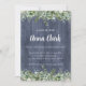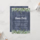 Celebrate your graduate's incredible milestone with this elegant graduation invitation featuring eucalyptus greenery and white florals on a stunning navy wood background. Honour their accomplishments with a beautifully designed announcement that sets the perfect tone for their celebration.