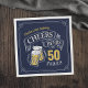Stylish cheers and beers to 50 years typography design in navy blue, yellow and white, custom it with your own text, fun and unique, great for any age adult birthday party for men, or anniversary party for any occasion.