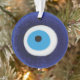 Showcase timeless protection with this elegant Nazar Evil Eye Protection Symbol Ornament. Crafted to embody the ancient Turkish amulet, it features a vibrant blue-and-white eye motif set against a glossy ceramic surface. Lightweight yet sturdy, it hangs beautifully in windows, doorways, or cars to ward off negative energy. Whether displayed in your home or gifted to loved ones, this meaningful ornament brings both style and spiritual significance. A perfect blend of tradition, décor, and intention.