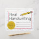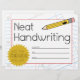 A classroom award certificate to reward students for their neat handwriting. Background is notebook paper illustration. Design also includes illustrations of a yellow pencil and a gold seal.