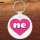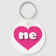 This keychain features a vibrant hot pink heart containing the bold, white, rounded lower case letters ne, a playful abbreviation for Nebraska, the cornhusker state.