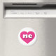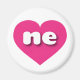 This magnet features a vibrant hot pink heart containing the bold, white, rounded lower case letters ne, a playful abbreviation for Nebraska, the cornhusker state.