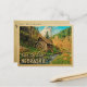 Vintage Nebraska Save The Date postcard in fun retro mid-century style. It features a rustic woody nature landscape with a wood cabin and water wheel mill, and a pretty creek stream with fall leaves for an autumn or end of summer feel. This Nebraska Save The Date postcard will be perfect for a country wedding or nature and camping wedding.