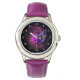 Nebula watch design on a purple watch strap. The watch has a fantasy space design with a passion flower surrounded by space gasses and stars. The numbers can be removed, it is your choice.