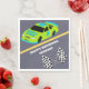 Create personalised party supplies that are perfect for Need 4 Speed themed 4th birthday parties. These paper napkins feature an illustration of a stock car style race car in lime green and bright blue. The number 4 car has the slogan NEED 4 SPEED on the hood. The graphic is set against a grey race track background and accompanied by two chequered flags. The napkins are ready to be personalised with your slogan in bold white lettering.