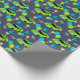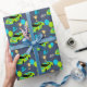 This fun wrapping paper is perfect for 4th birthday parties. The wrapping paper features illustrations of stock car style race cars in lime green and bright blue with the number 4 and the slogan NEED 4 SPEED. Along with the race cars are balloons, trophies, racking helmets and chequered flags. The graphics are set against a navy blue background.