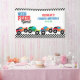 NEED FOUR SPEED MONSTER TRUCK BIRTHDAY BANNER. COLORFUL TRUCKS WITH BLACK AND WHITE GROOVY CHECKERED PATTERN RETRO STYLE EDITABLE KIDS BIRTHDAY VINYL BANNER