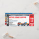 Need four speed monster truck race ticket 4th birthday invitation designed as a VIP admission ticket featuring colourful monster trucks and chequered flag.