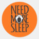 Typographical slogan sticker in bright orange, black and white. Reads: Needs more sleep. Ideal for those with a lack of sleep or in need of more sleep. Uniquely designed by Sarah Trett.