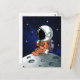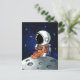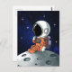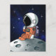 A whimsical illustration of a cute cartoon astronaut, spaceman sitting on top of the moon. The spaceman is wearing an orange spacesuit, white gloves and white helmet with a black visor. He has a badge at the top of his arm and dials and buttons on the front of his suit. On his back is a backpack for his air. He has one arm to his side and the other bent up to his helmet to make him look like he is thinking. His legs are outstretched in front of him. He is sitting on top of a grey/white moon that has shadows and craters. The background is a black and blue galaxy with bright white twinkling stars.