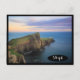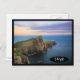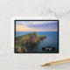 Postcard of a landscape with the iconic Neist Point Lighthouse, built on the cliffs at the western coast of the island of Skye, one of the Hebrides in Scotland, at sunset with a black edge and in a black round bullet the text 'Skye'.