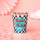 Neon 90's retro Seven is a vibe 7th birthday paper cups with hearts, daisies, disco ball and chequered background.
