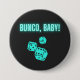 Fun button for bunco lovers.  Bunco, Baby! text in aqua neon with matching rolling dice has a vintage / retro feel