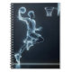 Glowing blue neon basketball player ready to dunk the ball in the net