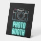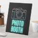 Neon camera with photo booth text on black background. Great design for weddings, birthday parties and other special events.
