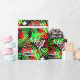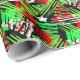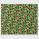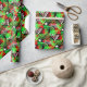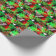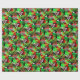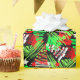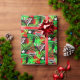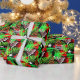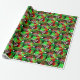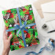 A fun Christmas wrapping paper feature bright red, green and white neon Christmas trees on a black background.